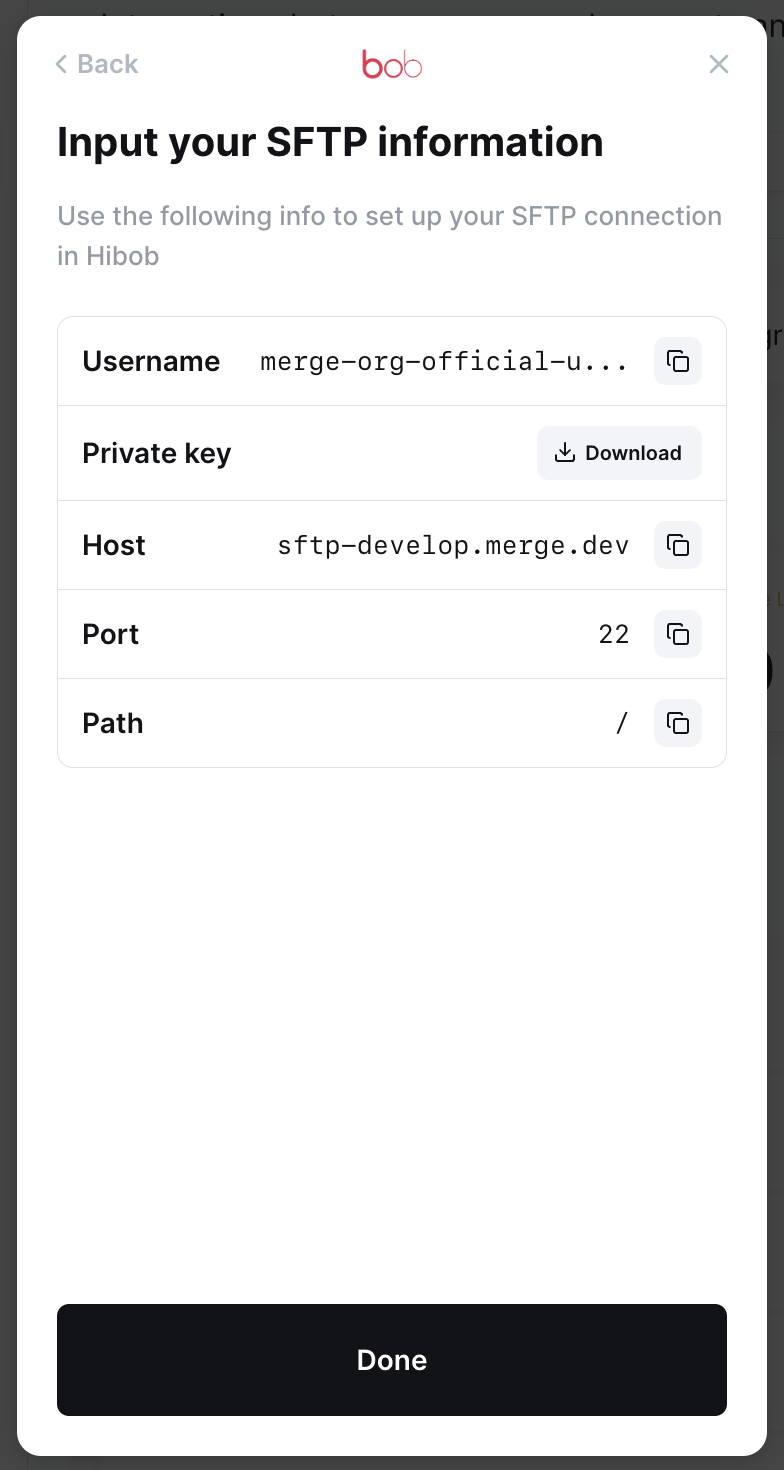 Return to your Link Portal (see below) to get the following information for HiBob: Username, Private key file, Host, Port, Path, then click save.