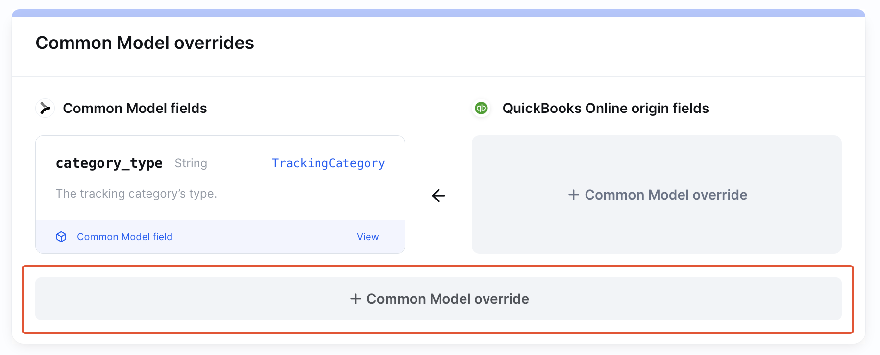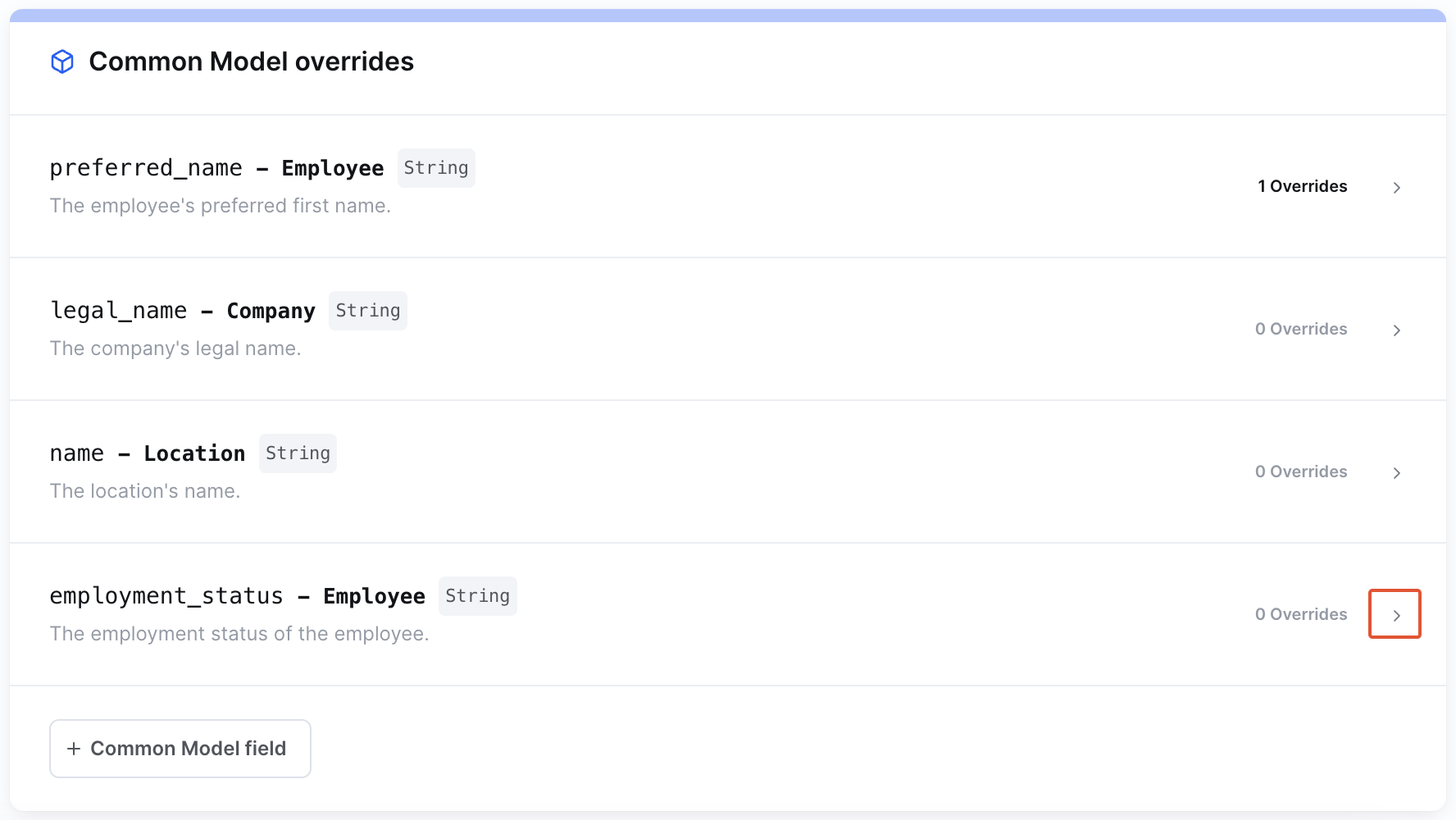 You will be taken to the overrides page for the given config. Find the integration(s) you'd like to set the override for and select the + Common Model override button. Choose the field you'd like to see the override to.