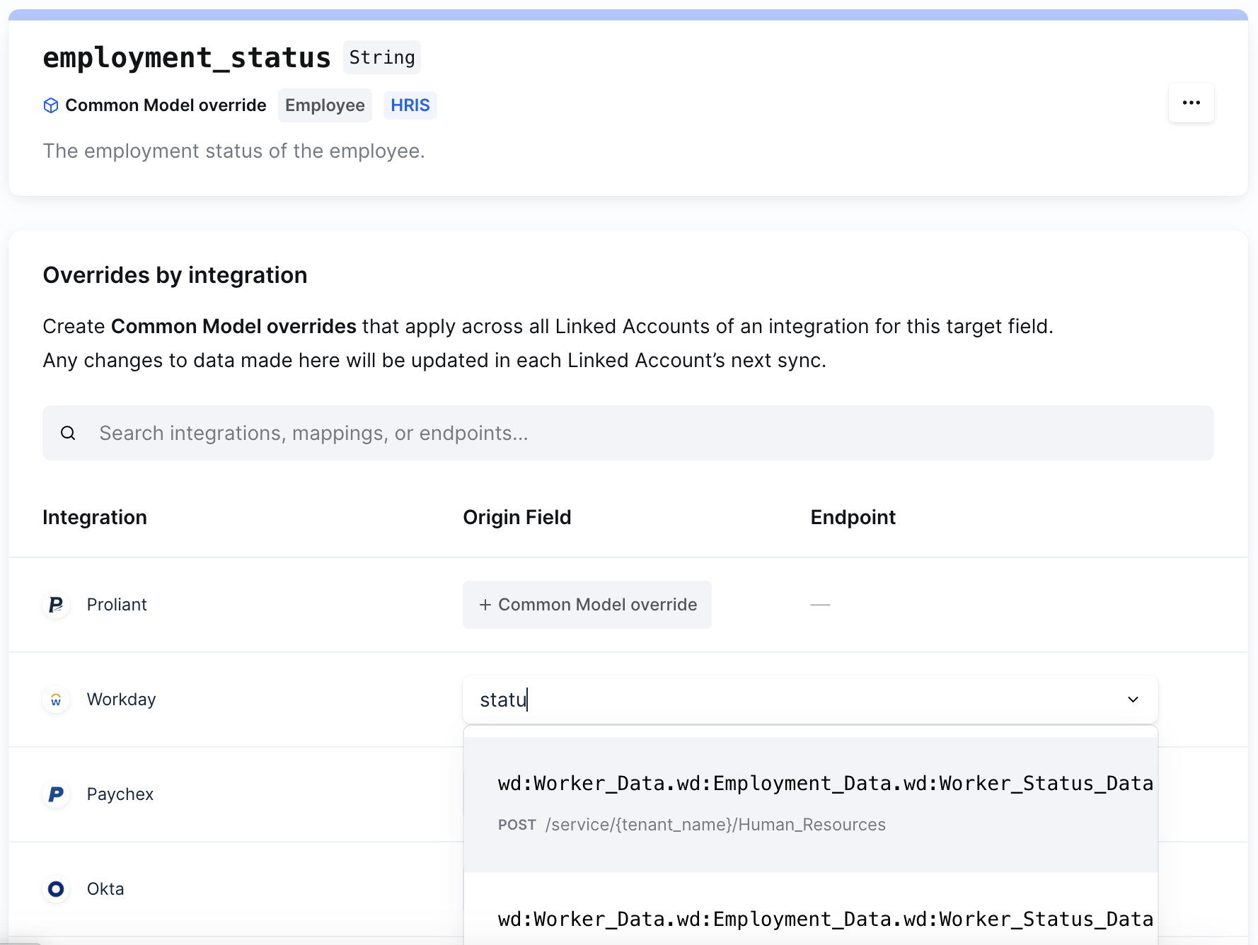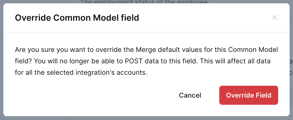 Merge retrieves data from each third-party platform and normalizes that data into common models. In most cases, you don't need to worry about the nuances of every field in every platform but there may be some scenarios where you'll have to. Maybe your customer uses a custom BambooHR field named "Family Name" instead of the default "Last Name" field. Or maybe you disagree with the way Merge has mapped a field for a given integration. For scenarios like these, Merge allows you to change these default mappings through the Override Common Model Field feature.
