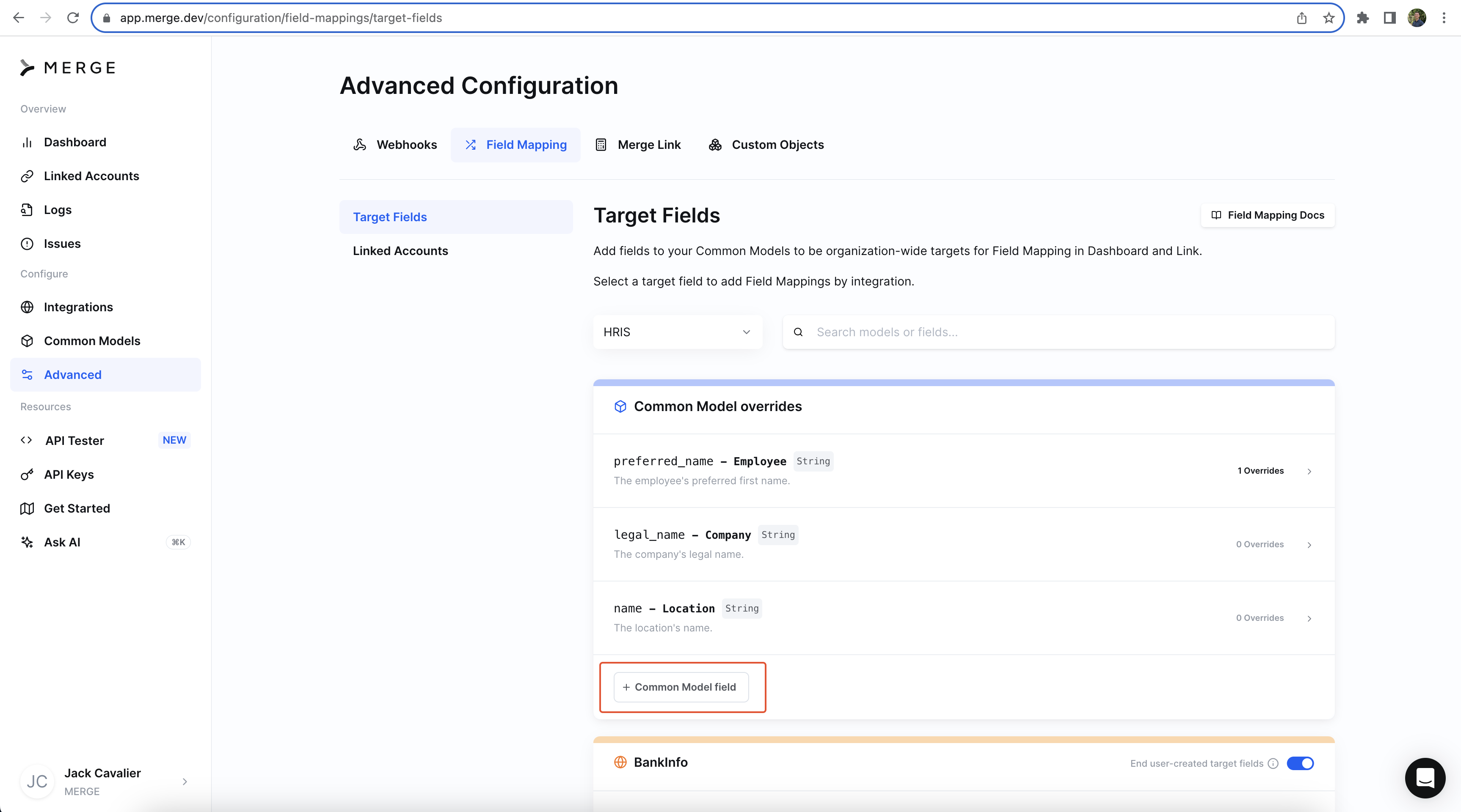 Navigate to the Advanced > Field Mappings page within your Merge Dashboard.