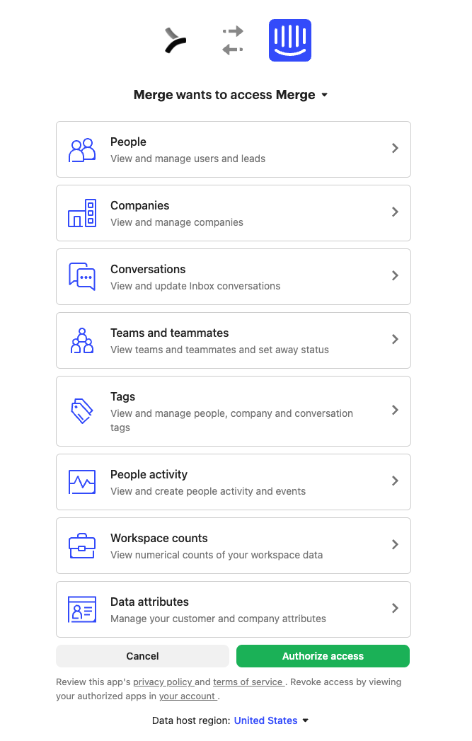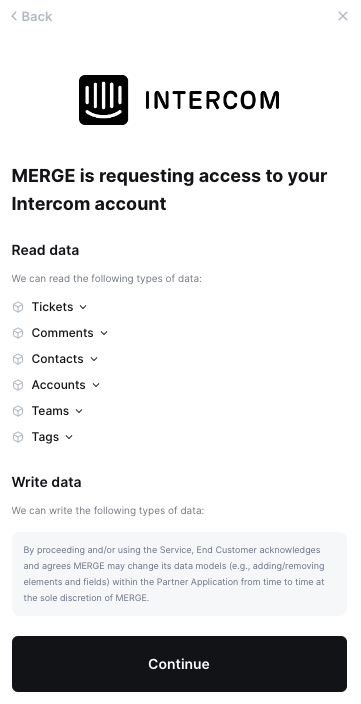 Open the linking flow and select Ticketing > Intercom. You should see a screen informing you that we are requesting to link your Intercom account.