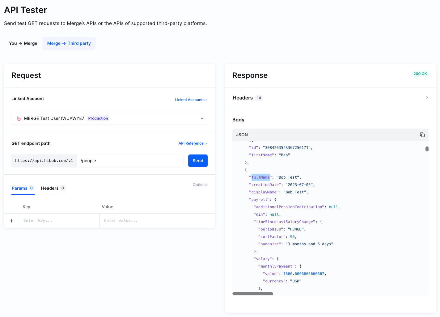 Merge API Tester enables customers to send test GET requests to Merge’s APIs or the APIs of supported third-party platforms.