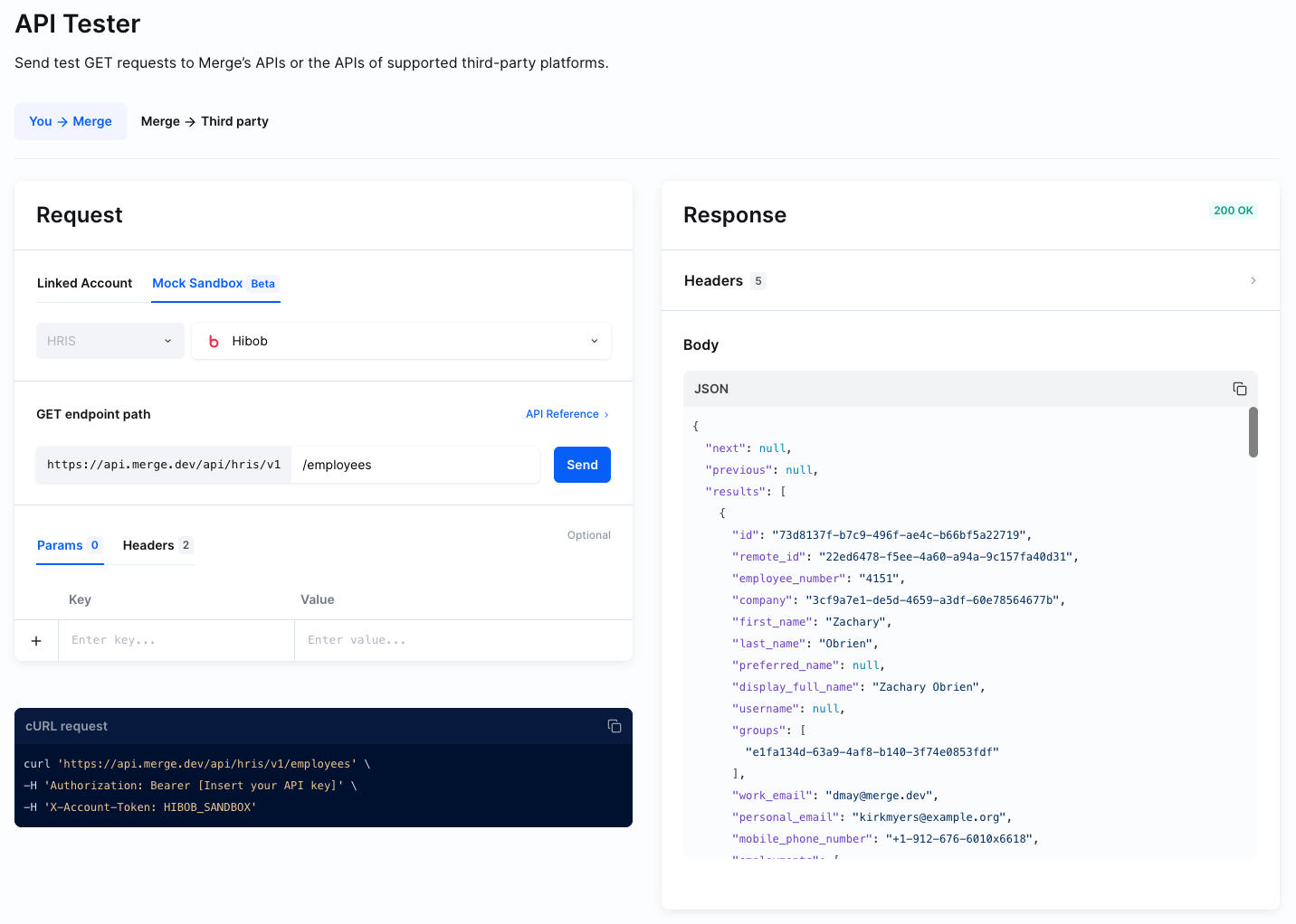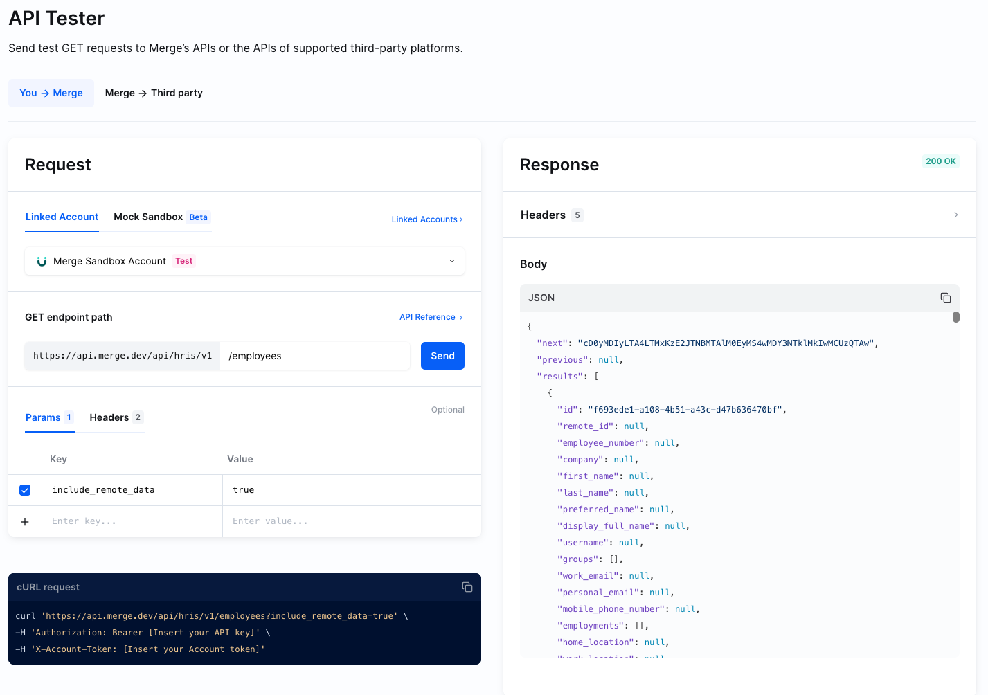 API Tester allows customers to send requests to both Merge's APIs and third-party APIs.