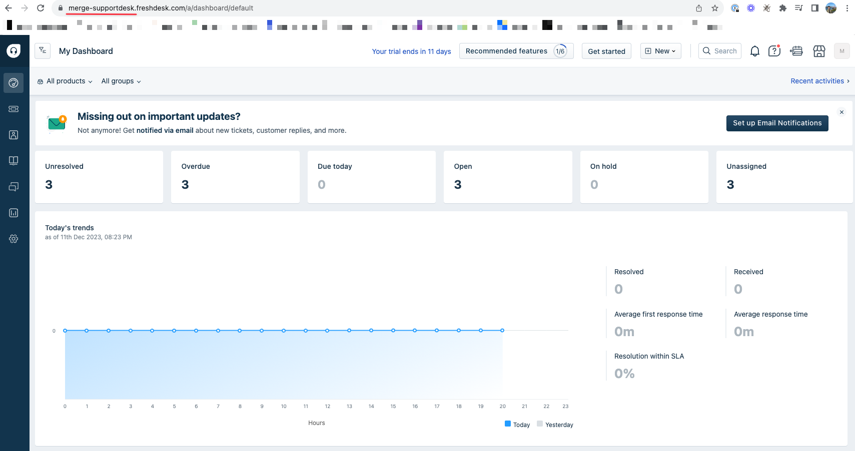 Log into Freshdesk and copy your subdomain, which can be found in the first part of the URL (highlighted in red in the screenshot below). For example, if your full Freshdesk URL is "merge-supportdesk.freshdesk.com", your subdomain is "merge-supportdesk"