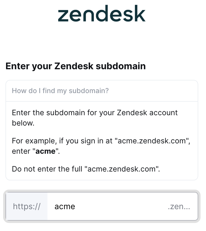 Identify the sign-in URL used for your Zendesk account. For example, if you sign in at "acme.zendesk.com", your subdomain would be "acme"