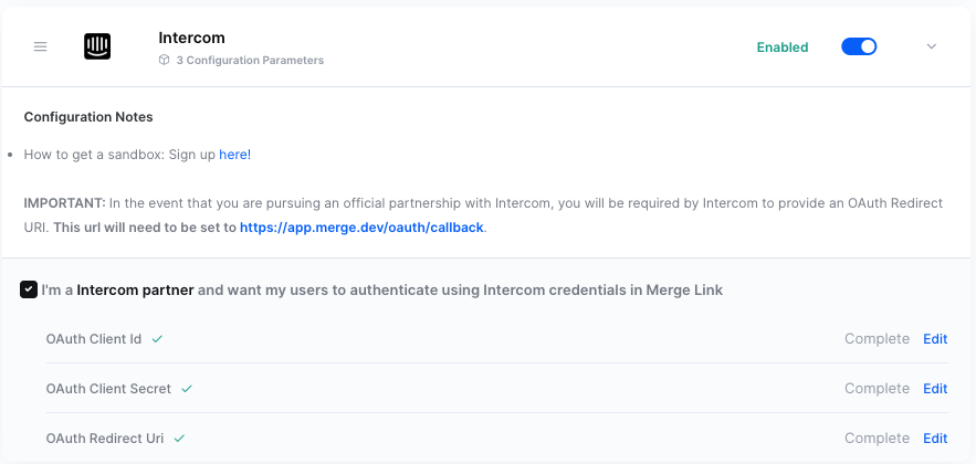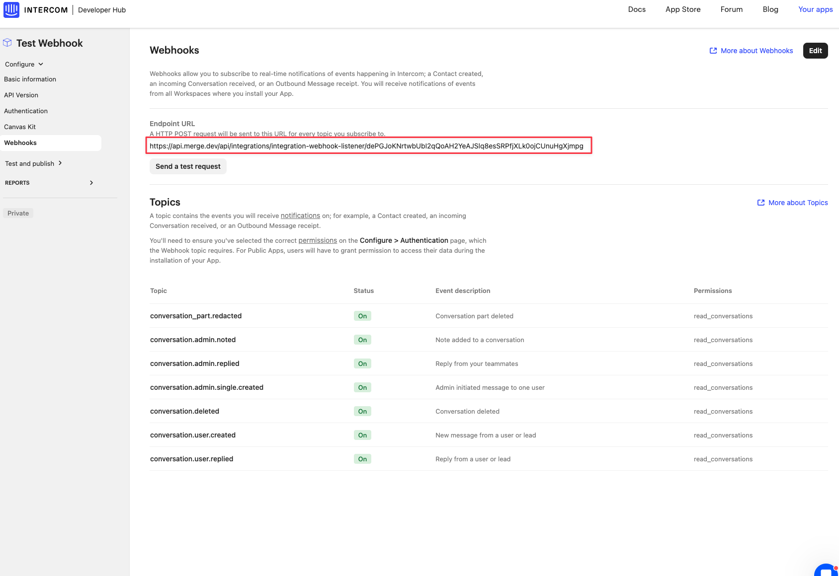 The Intercom receiving webhook set up is complete if you are NOT using partnership authentication!