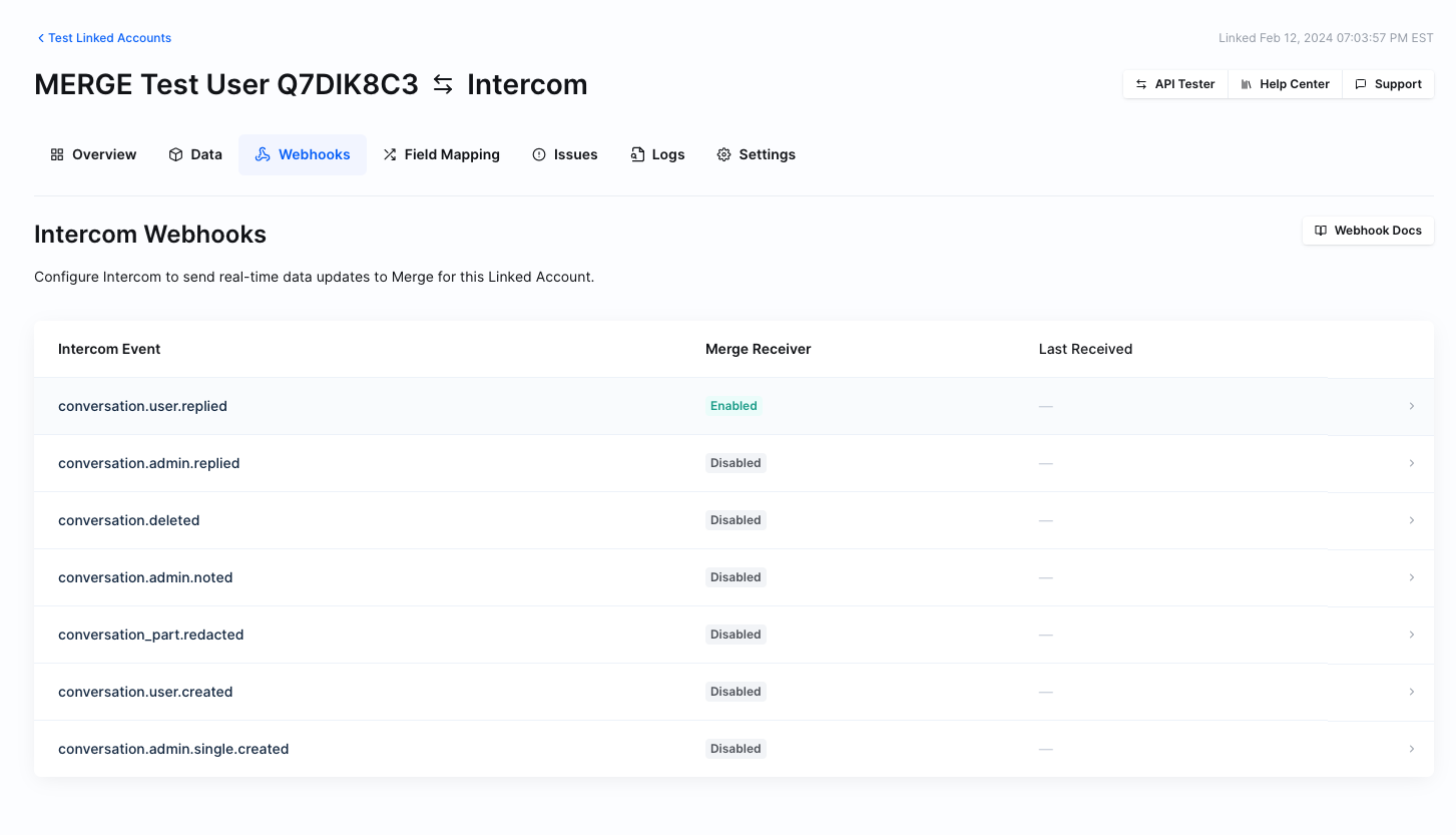 Go to the Intercom linked account and enable all the webhooks you are require.