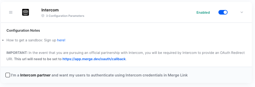 Once the Intercom account has been linked, check if you are using Intercom partnership authentication. Go to Integrations -> Ticketing and find Intercom. If the "I'm a Intercom Partner..." box is checked and there are credentials entered, you are using partner authentication. If it is not checked, you are not.