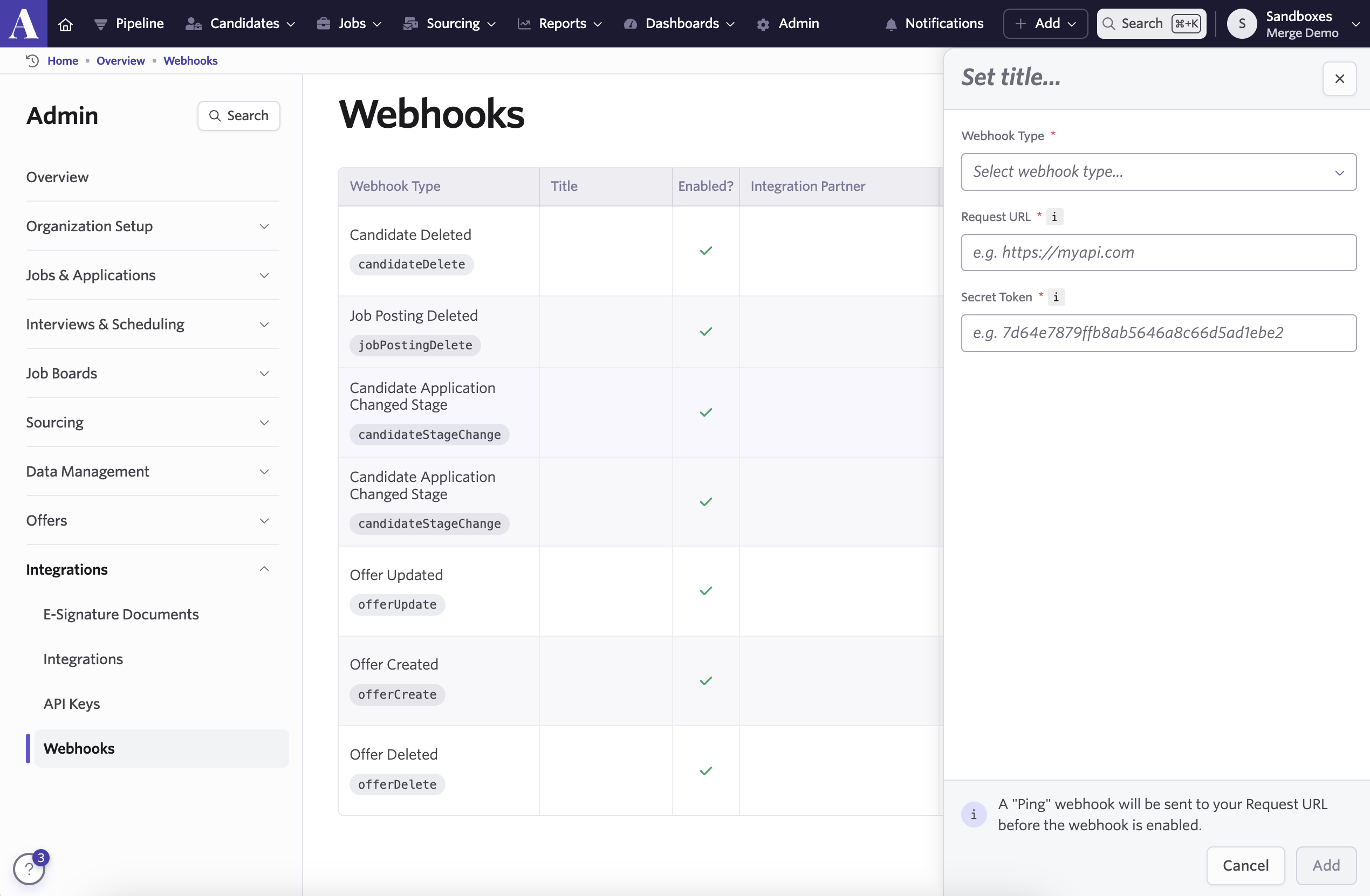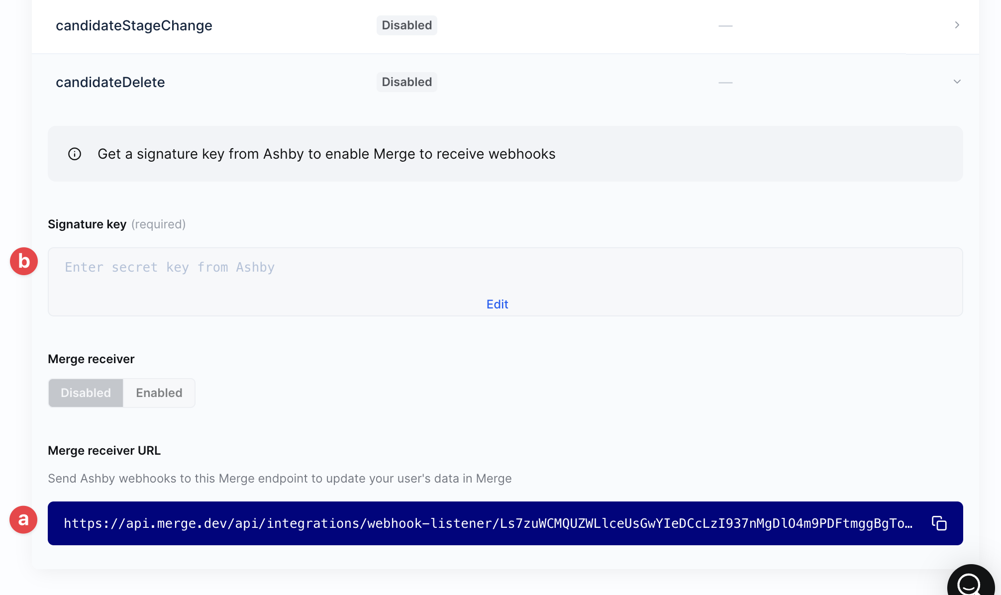 Merge Receiver URL: this will need to be given to your end user to add to their webhook configuration in Ashby