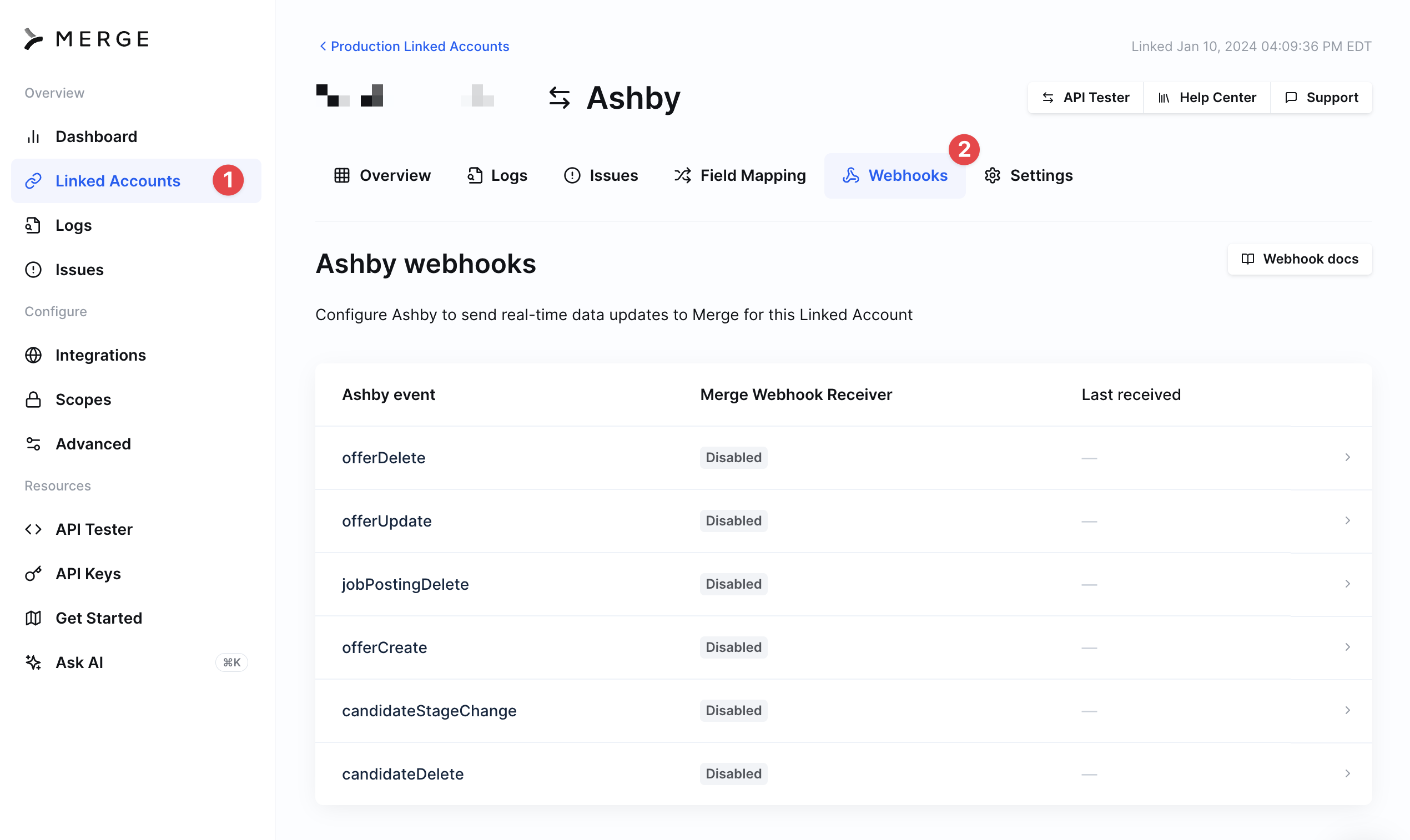 In your Merge dashboard, go to the Linked Accounts page and select the Ashby linked account you'd like to add webhooks for.