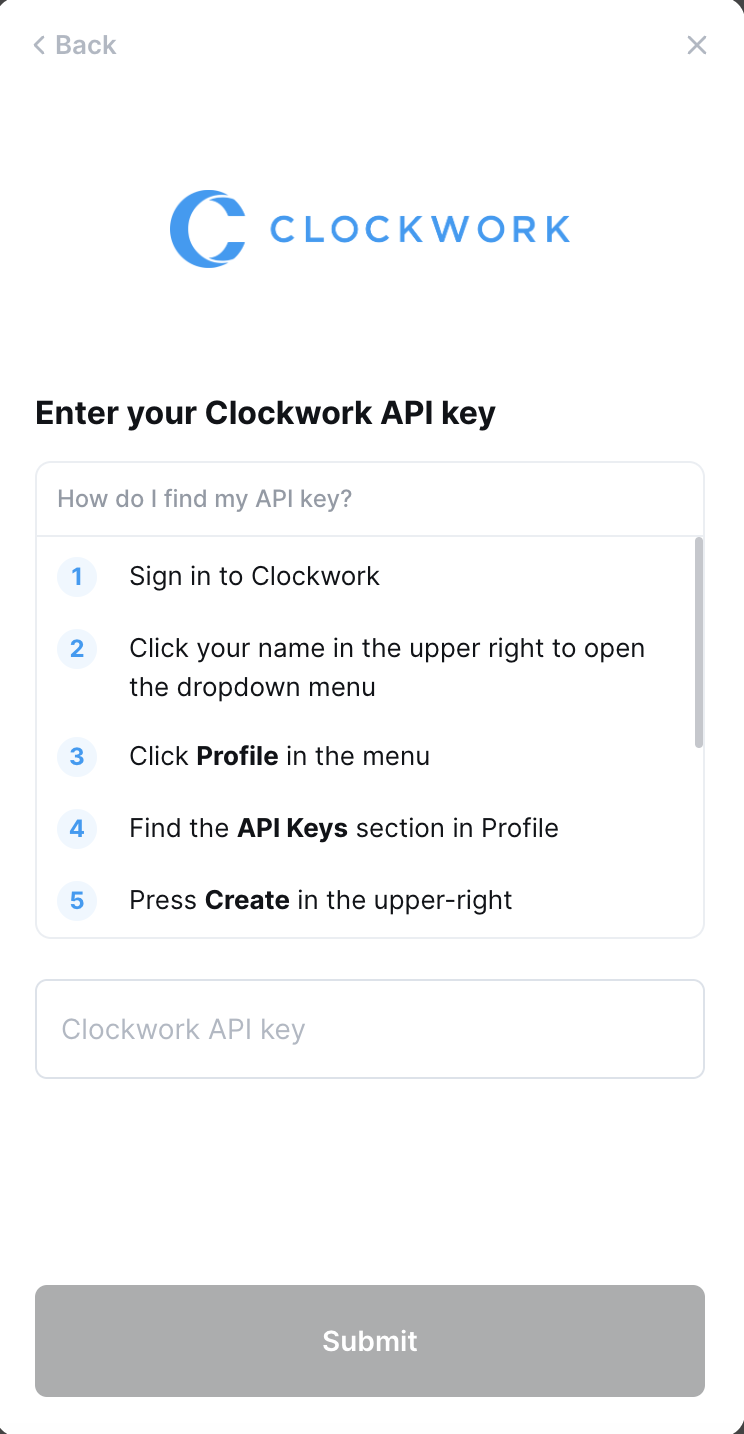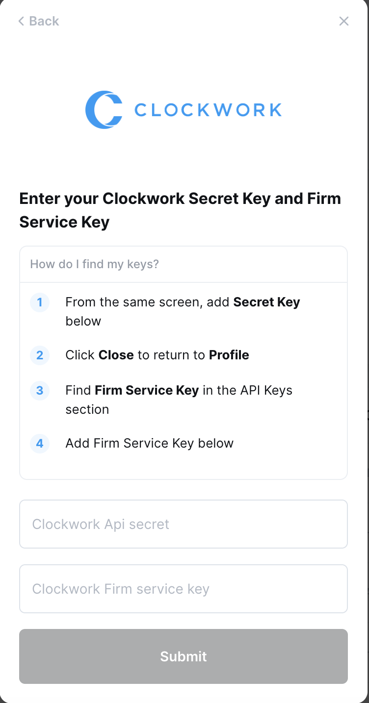 This guide will walk you through finding or creating those credentials within Clockwork.