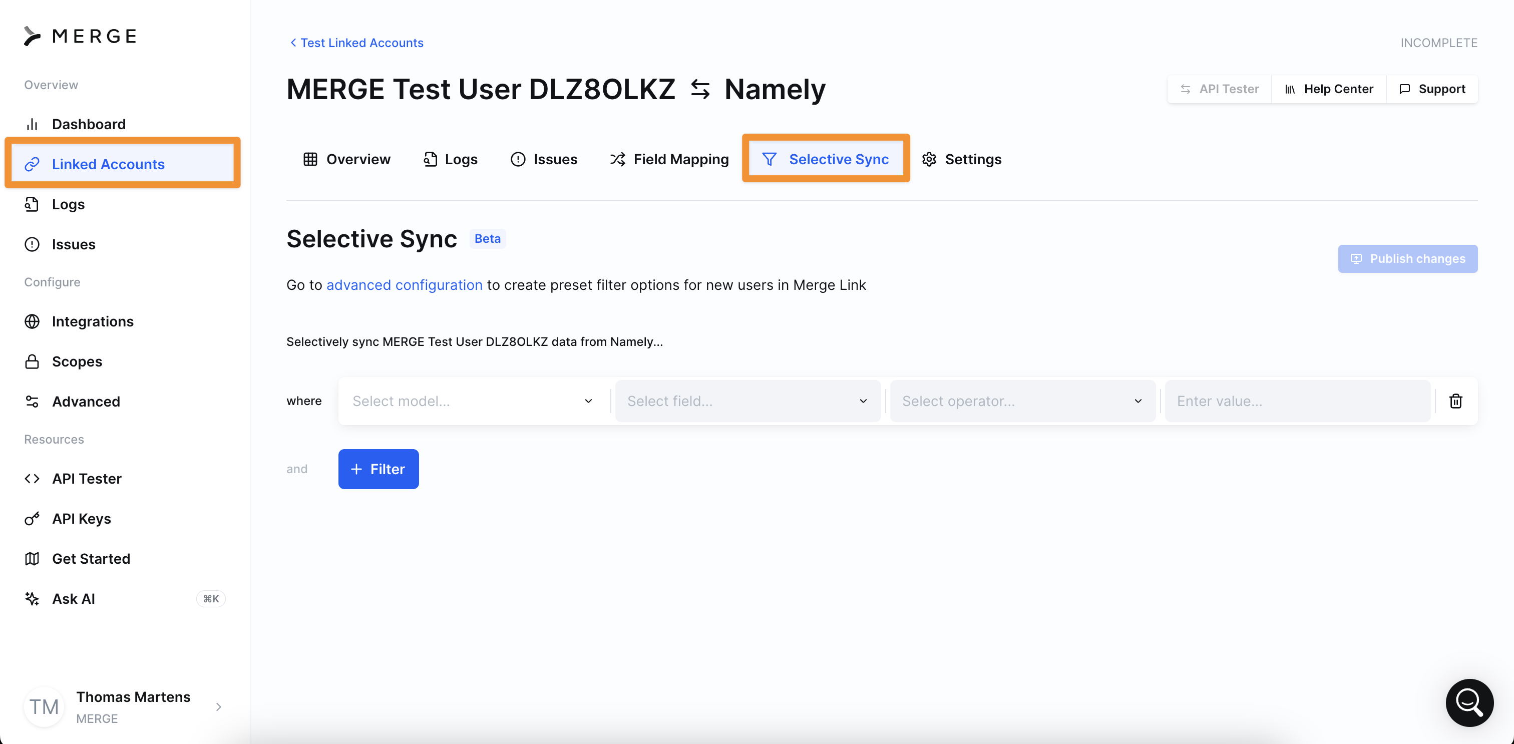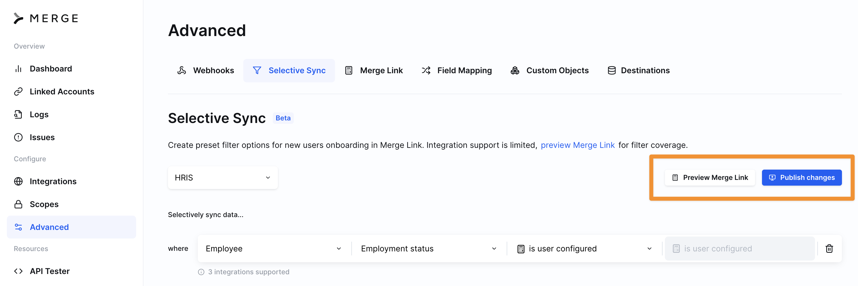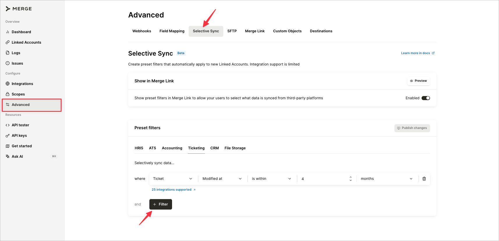 You can configure Selective Sync under the Advanced → Selective Sync section of your Merge Dashboard. To use a new filtering option yourself (or let your users choose), simply hit the + Filter button at the bottom of the page.