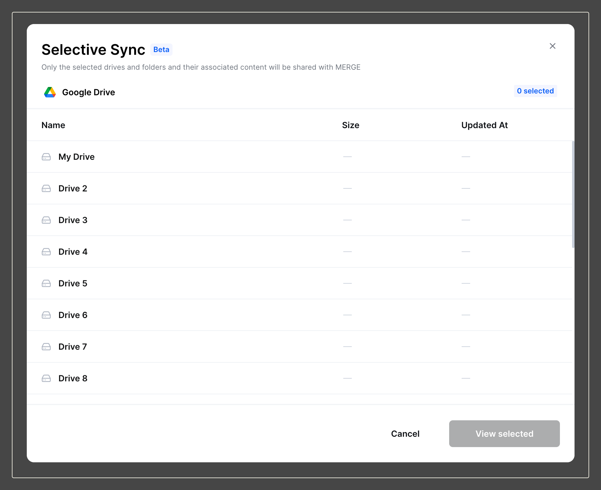 We've implemented Selective Sync for File Storage integrations, allowing your end users to select a specific subset of Folders, and/or Drives in their connected account to give access to, rather than the default behavior of syncing all data.