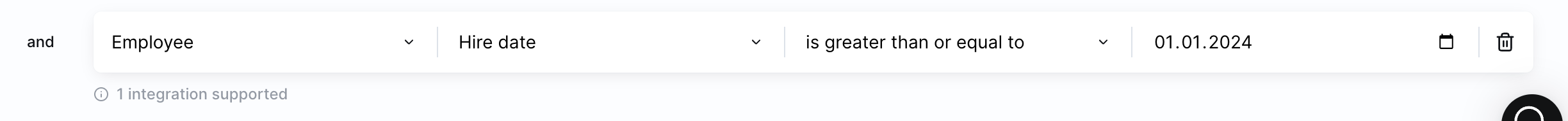 For example, if you only wanted to sync employees hired in 2024 or later, you could configure Employee as your common model, Hire date as the field to filter on, is greater than or equal to as your filter, and a date of 01/01/2024 as the filter value, as shown below: