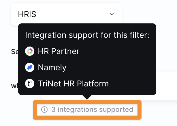 If you want your end users to control what data is synchronized, you'd instead select is user configured as your filter. Below each filter row, you can see how many integrations support that filter. Hover over the integrations supported row to see exactly which integrations are supported: