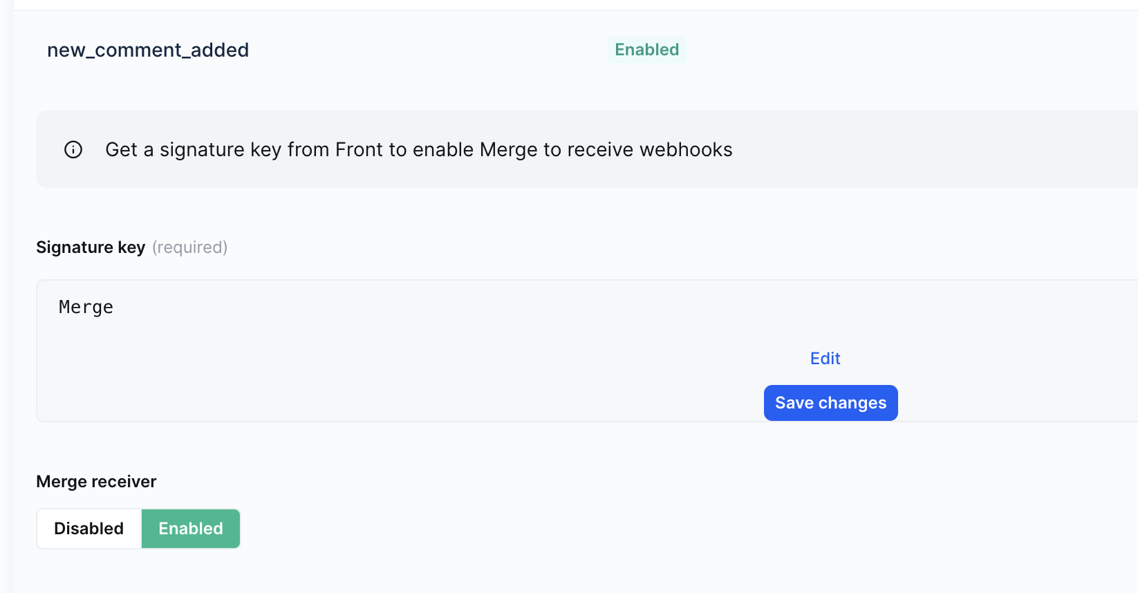 Go to the Front linked account and enable all the webhooks you are require. Enter Merge in the signature key field (the actual value does not matter).