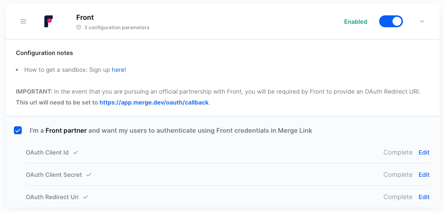 Note: The following steps only need to be completed once. After this is complete, you will only need to enable the webhook events in the linked account page in Merge for additional linked accounts to support Front webhooks.