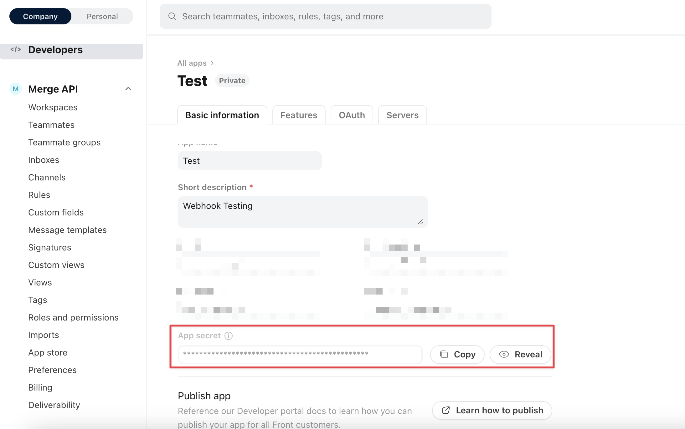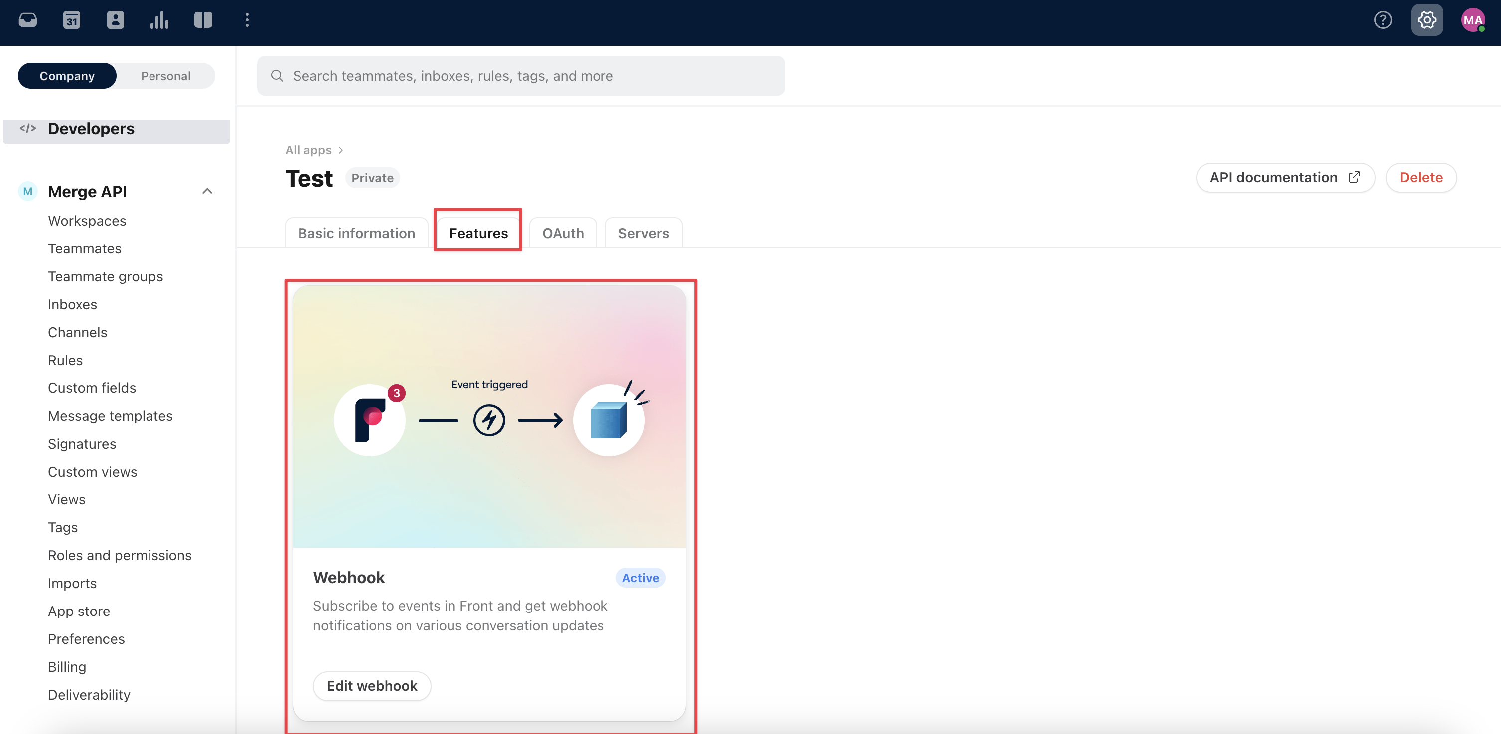 Next, go to your Front developer account and find your application. Go to Features and click "Create webhook".