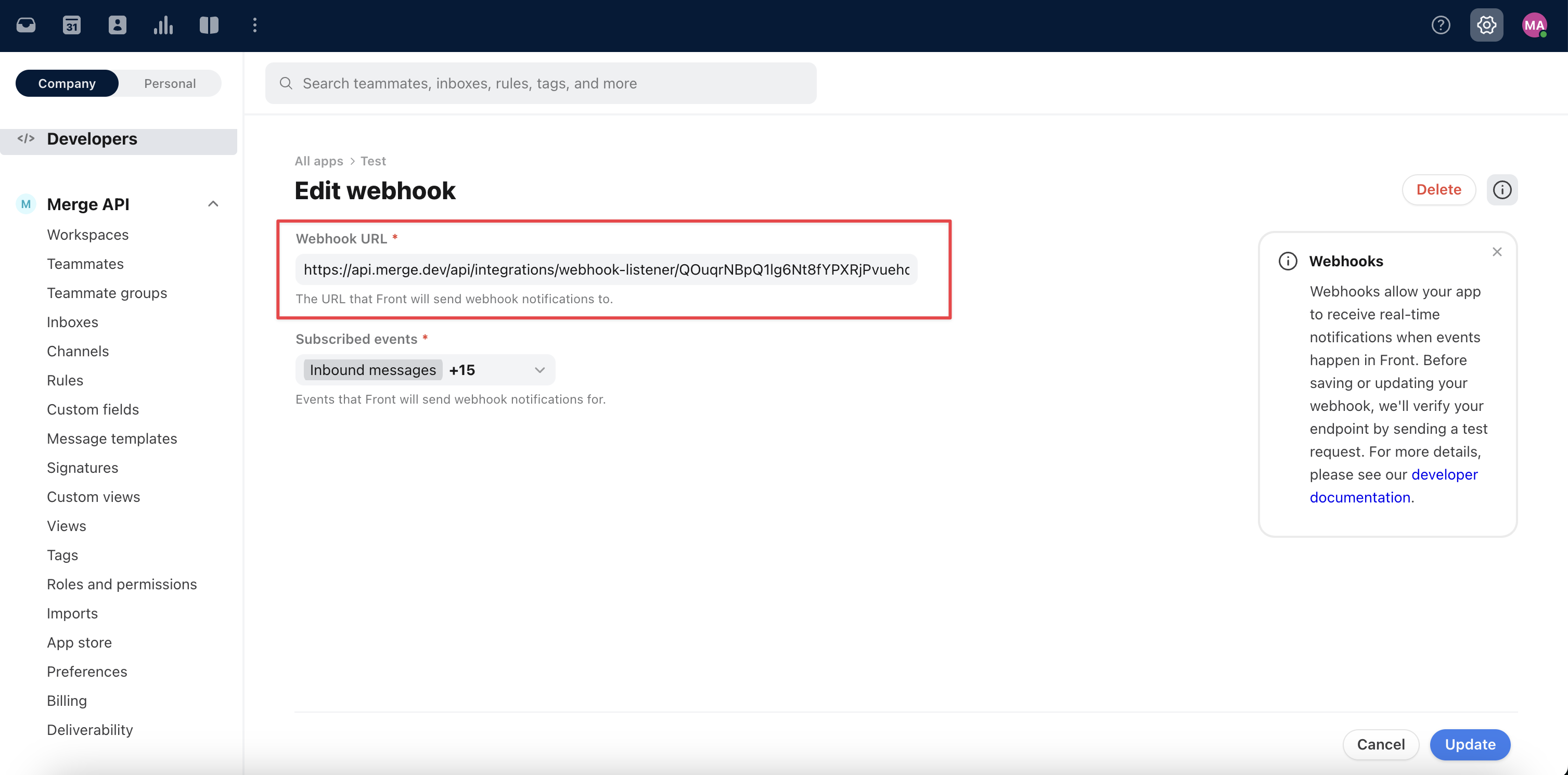 The Front receiving webhook set up is complete if you are NOT using partnership authentication!