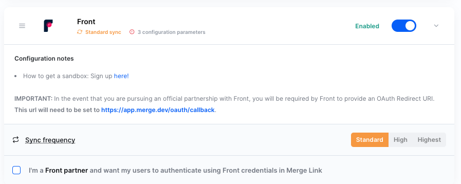 Once the Front account has been linked, check if you are using Front partnership authentication. Go to Integrations -> Ticketing and find Front. If the "I'm a Front Partner..." box is checked and there are credentials entered, you are using partner authentication. If it is not checked, you are not.