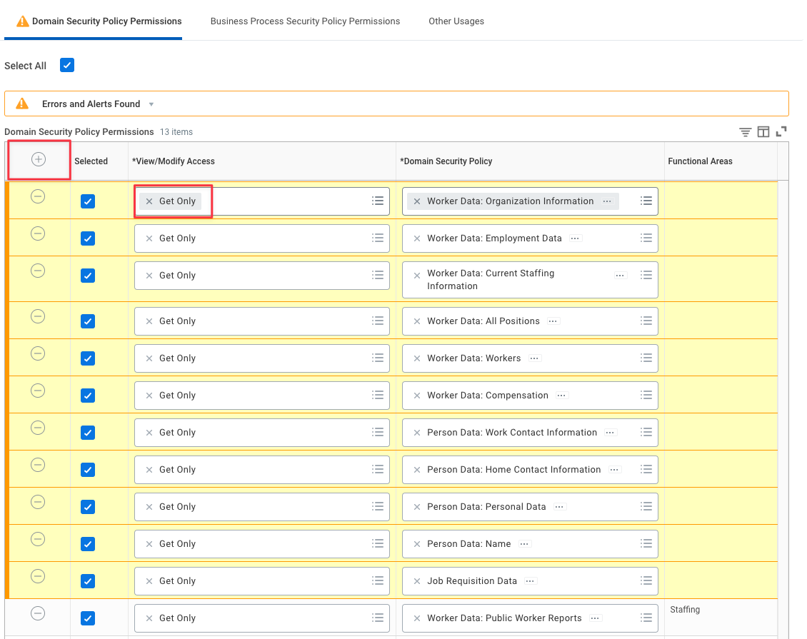 The Domain Security Policies below are optional and may be required for use cases that extend beyond a standard full Workday HRIS integration. If applicable to your use case, include all of them. If not, they may be omitted.