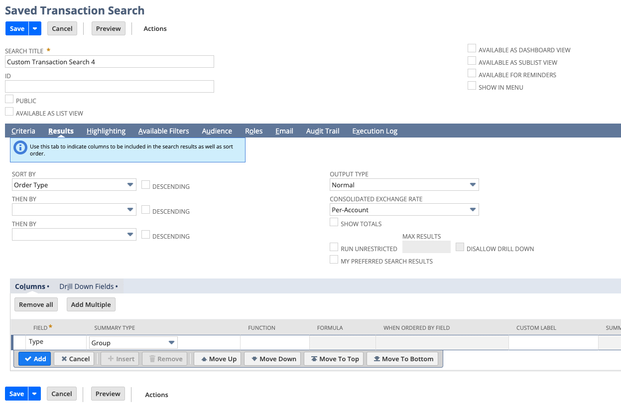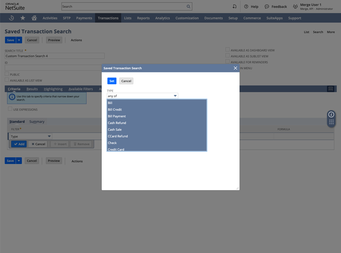 If you are experiencing discrepancies in the aggregated financial data for your NetSuite integration, it may be that your connection doesn't have access to view all posting transaction types in your NetSuite application. Running a search to grab all types of transactions used in your NetSuite application is a great way to determine if this is indeed the case.