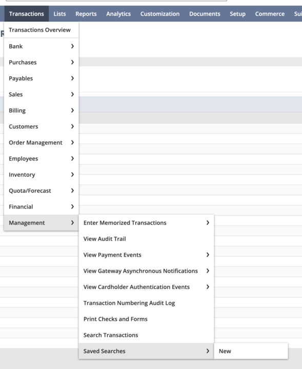 In your NetSuite instanced, go to Transactions -> Management -> Saved Searches -> New.