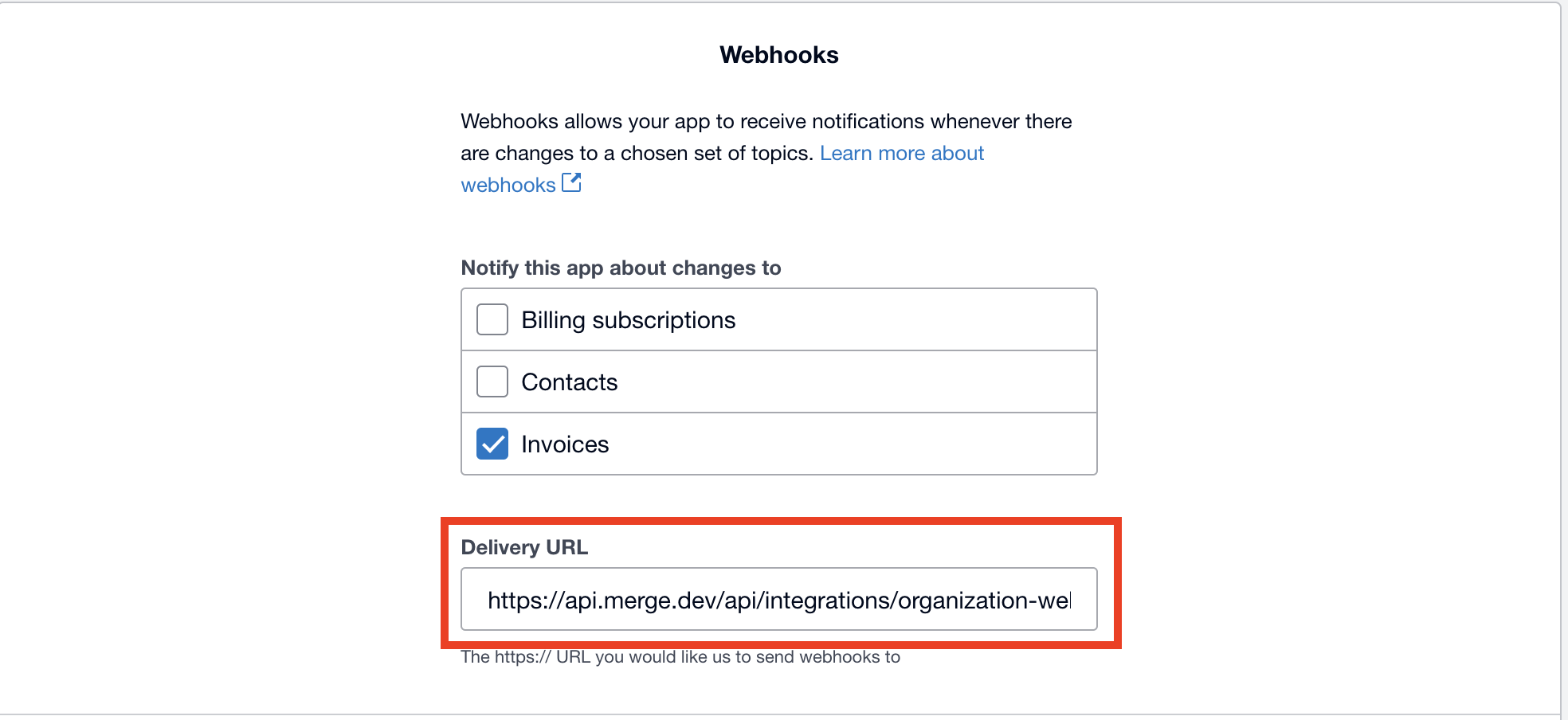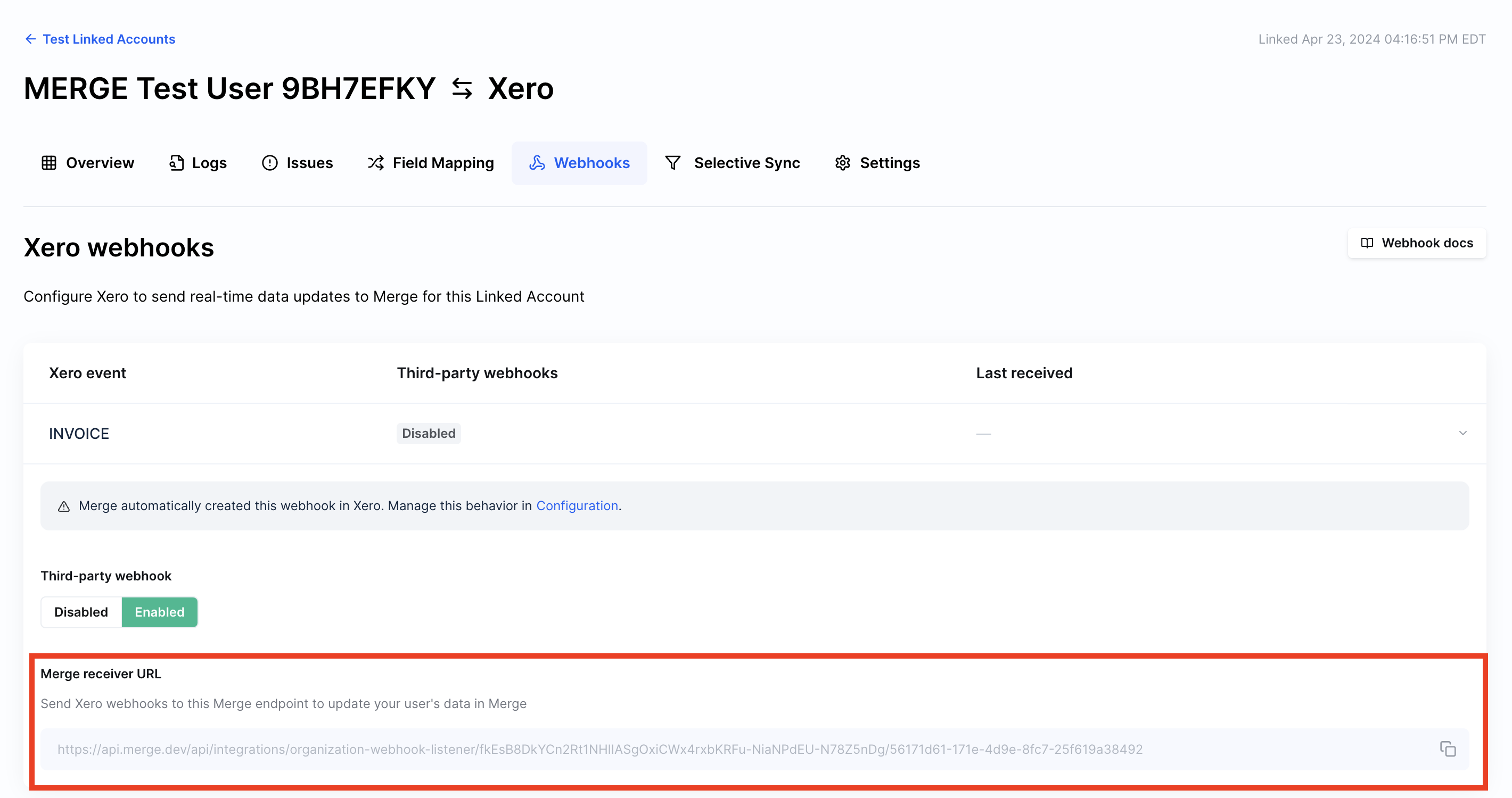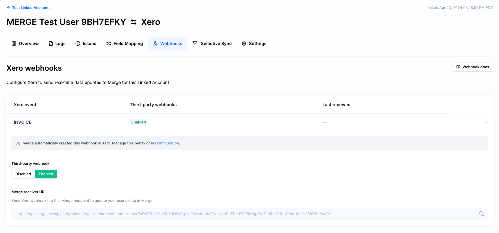 Note, Merge will turn on both the Invoice and Contact webhook receivers automatically. However, we'll still only process the types you've enable in Xero.