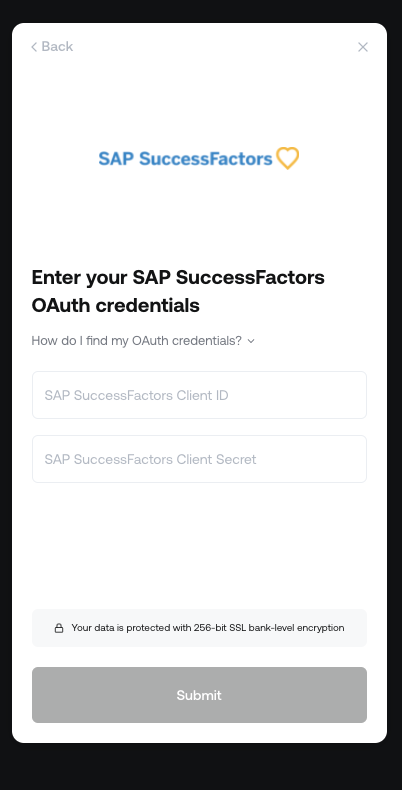 This guide will walk you through finding or creating those credentials within SAP SuccessFactors and entering it into the linking flow.