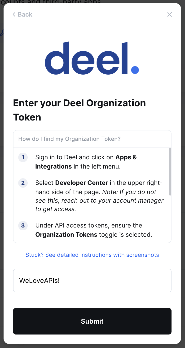 Your Deel account must have API access enabled. Contact your Deel account manager to confirm if you are unsure of this