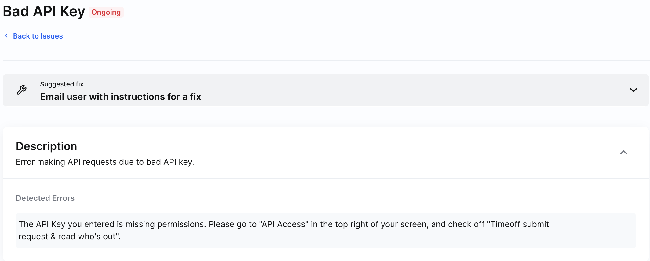 End-users can also make changes to their API Access after the point of linking, and we also want your CSMs to surface detailed remediation steps back to your customers. The Issues Dashboard will have these detailed remediation steps under "Description." The Issues API will also have detailed error messaging under "Error Details." You can send these messages right back to your customers to remediate any Issues that get generated!