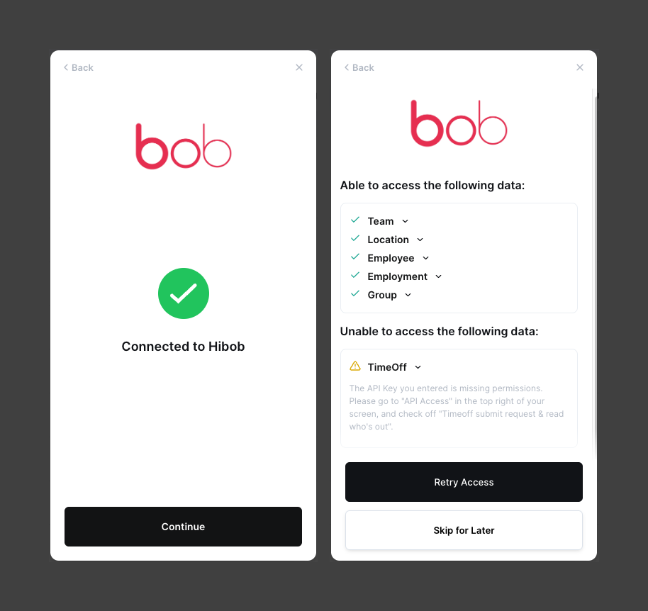 The API Credentials did not have access to the endpoint for Time-Off, so we surfaced the exact directions your end-user needs to complete to remediate this issue!
