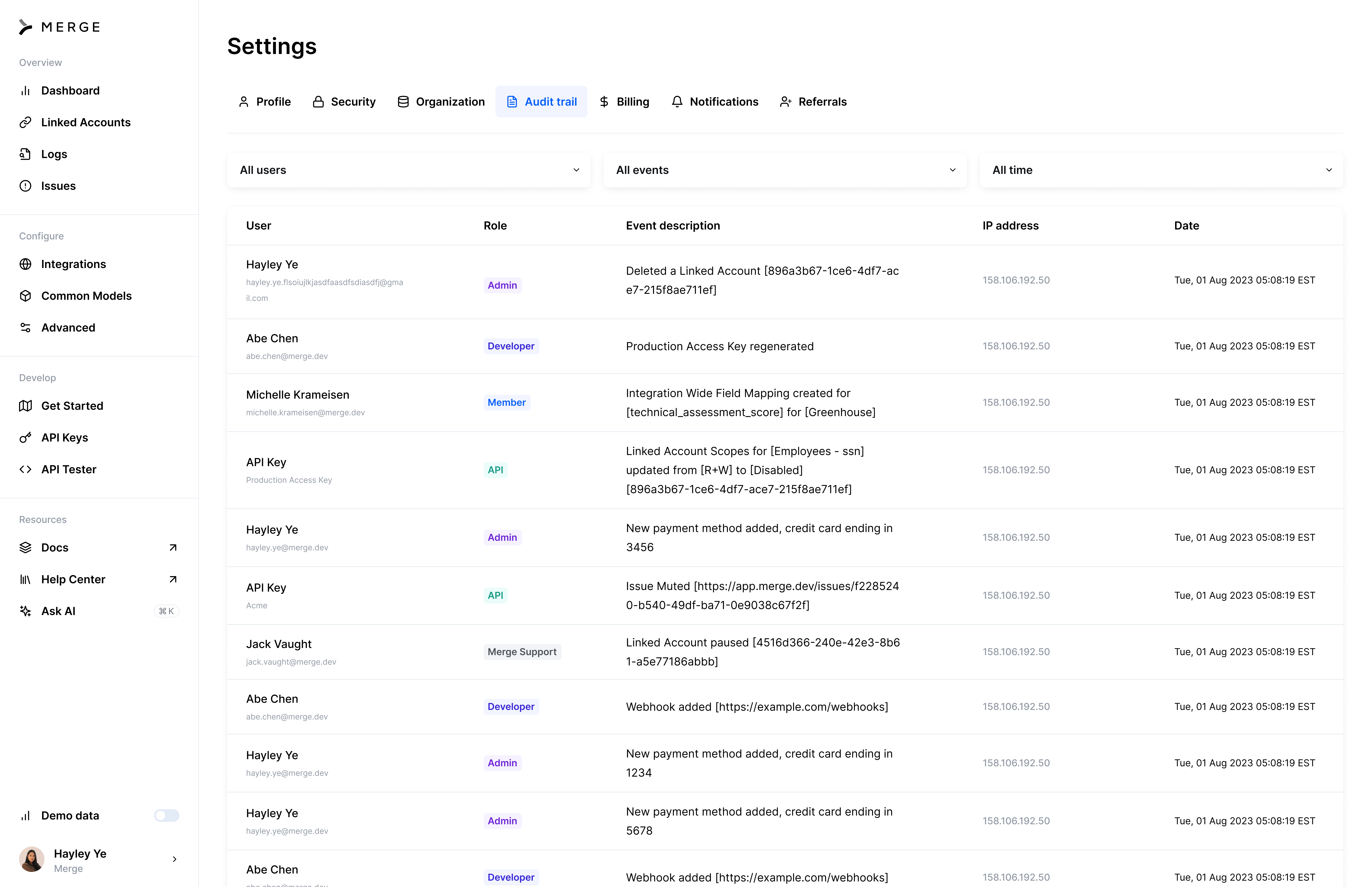 The Merge audit trail is a comprehensive record of activities and actions taken by users within Merge, ensuring transparency and accountability across your operations. This feature is available in your Dashboard Settings and available programmatically via our API.